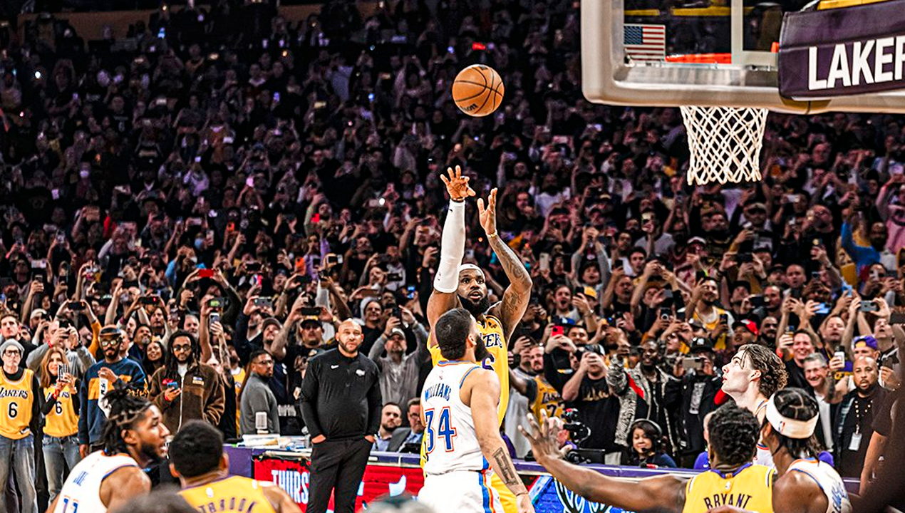 Cuando solo restaban 10 segundos para que culminara el tercer cuarto, el “King” se despachó un “fade-away” para encestar y llegar a la gloria. Tras ello, el partido estuvo parado por varios minutos, ya que la NBA procedió a homenajear a su nuevo máximo anotador.